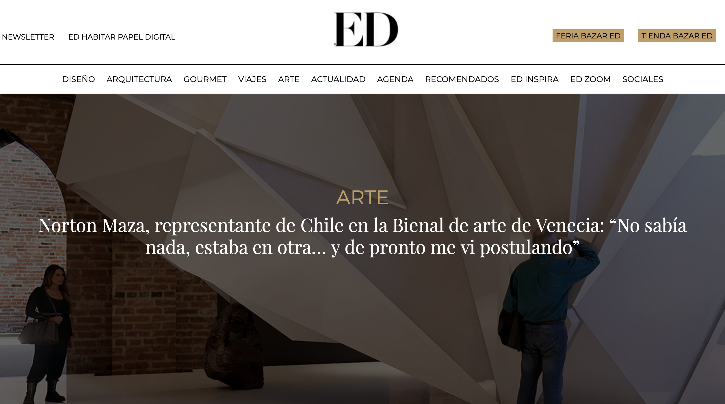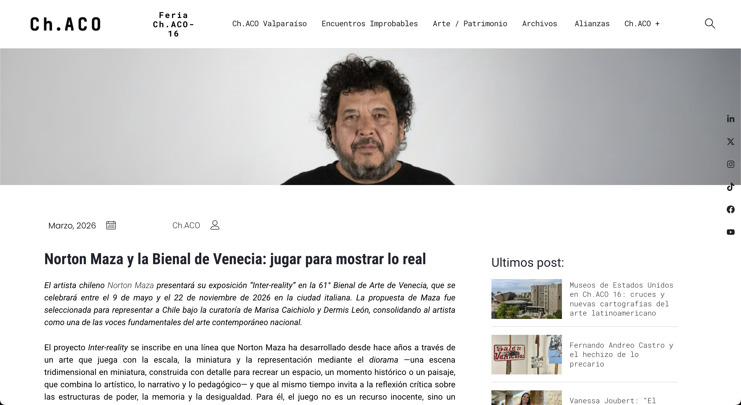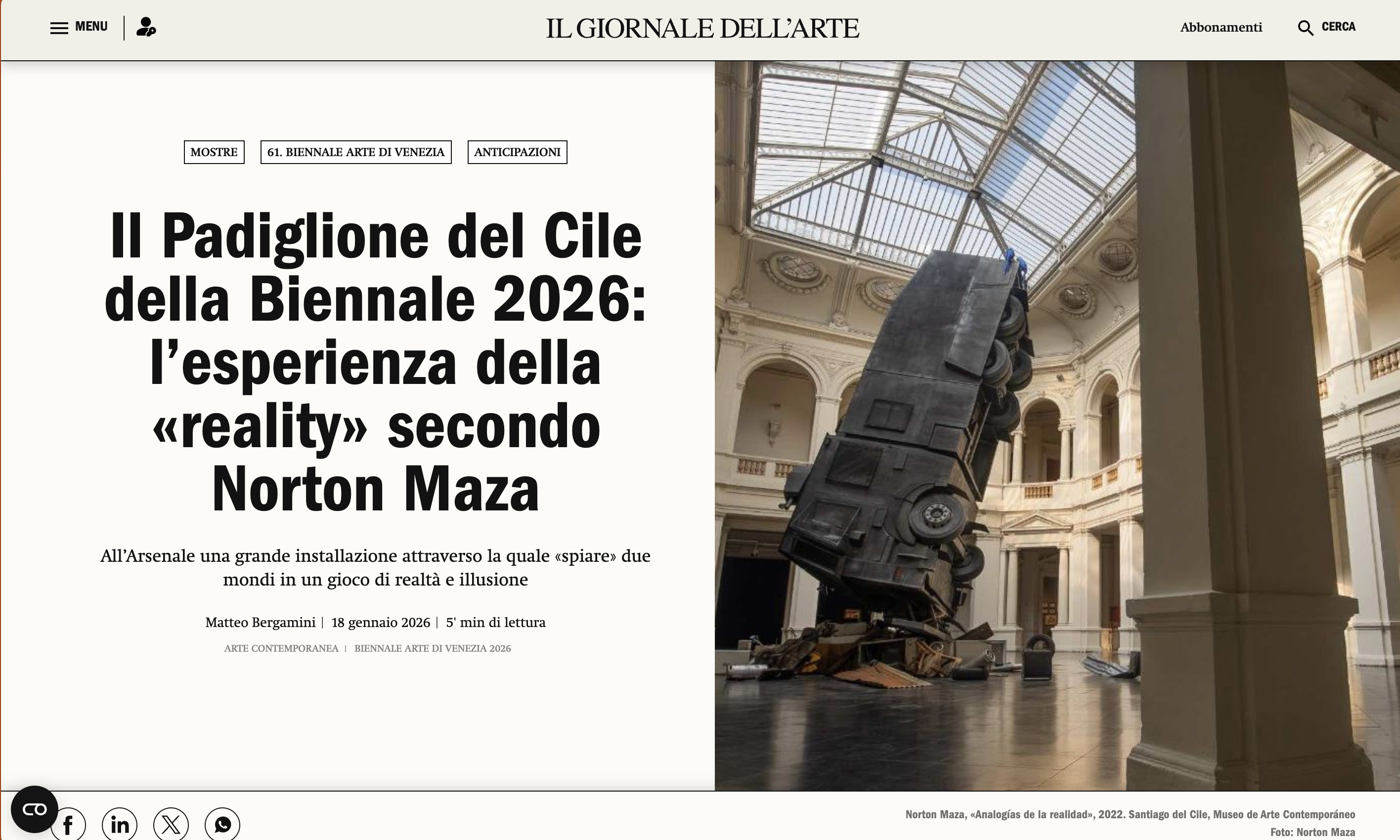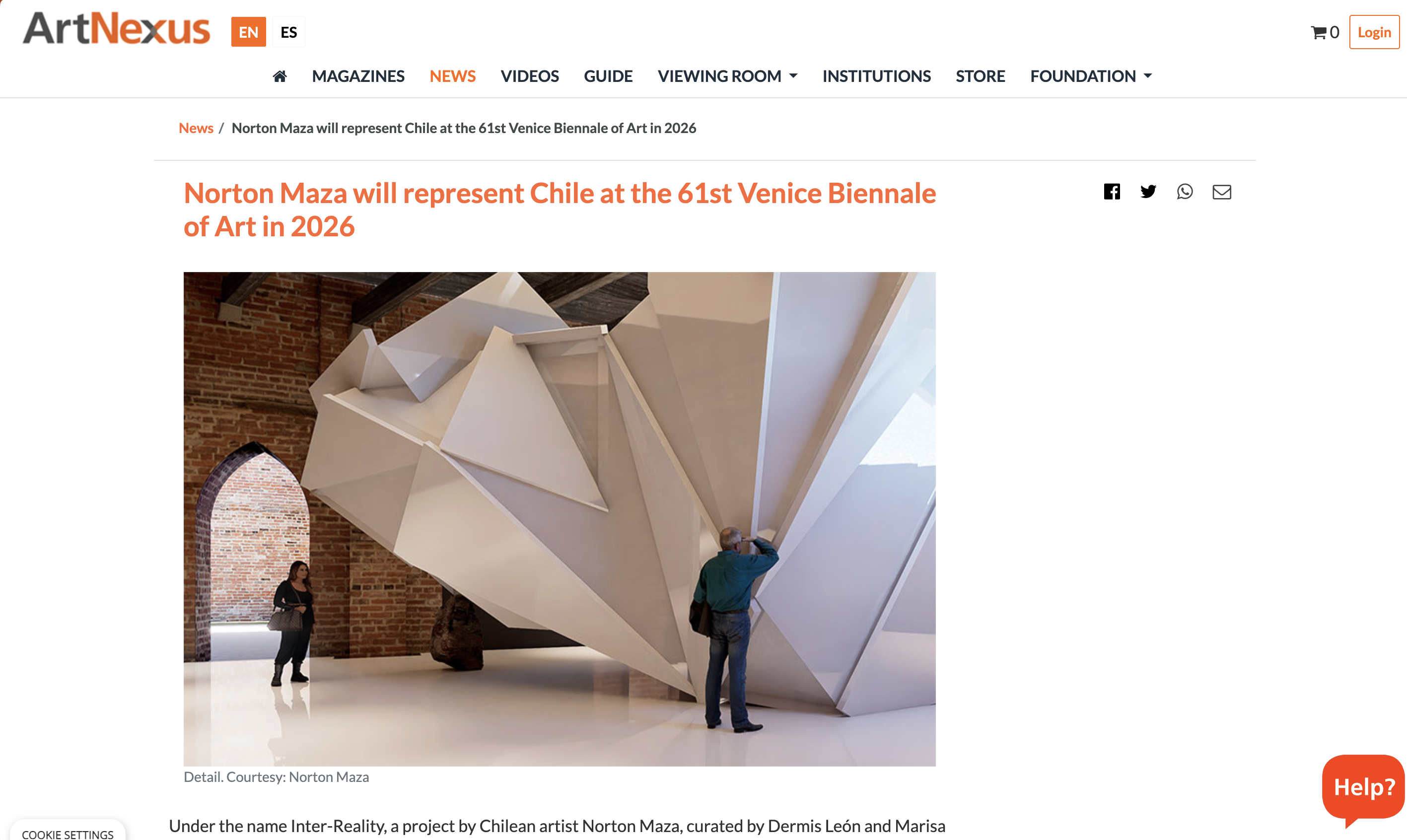 Inter-Reality, del artista Norton Maza, bajo la curatoría de Marisa Cachiolo y Dermis León y la gestión de Claudia Pertuzé, fue la propuesta seleccionada para representar a Chile en la 61° Bienal de Arte de Venecia, evento que se celebrará entre el 9 de mayo y el 22 de noviembre de 2026 en la ciudad italiana.