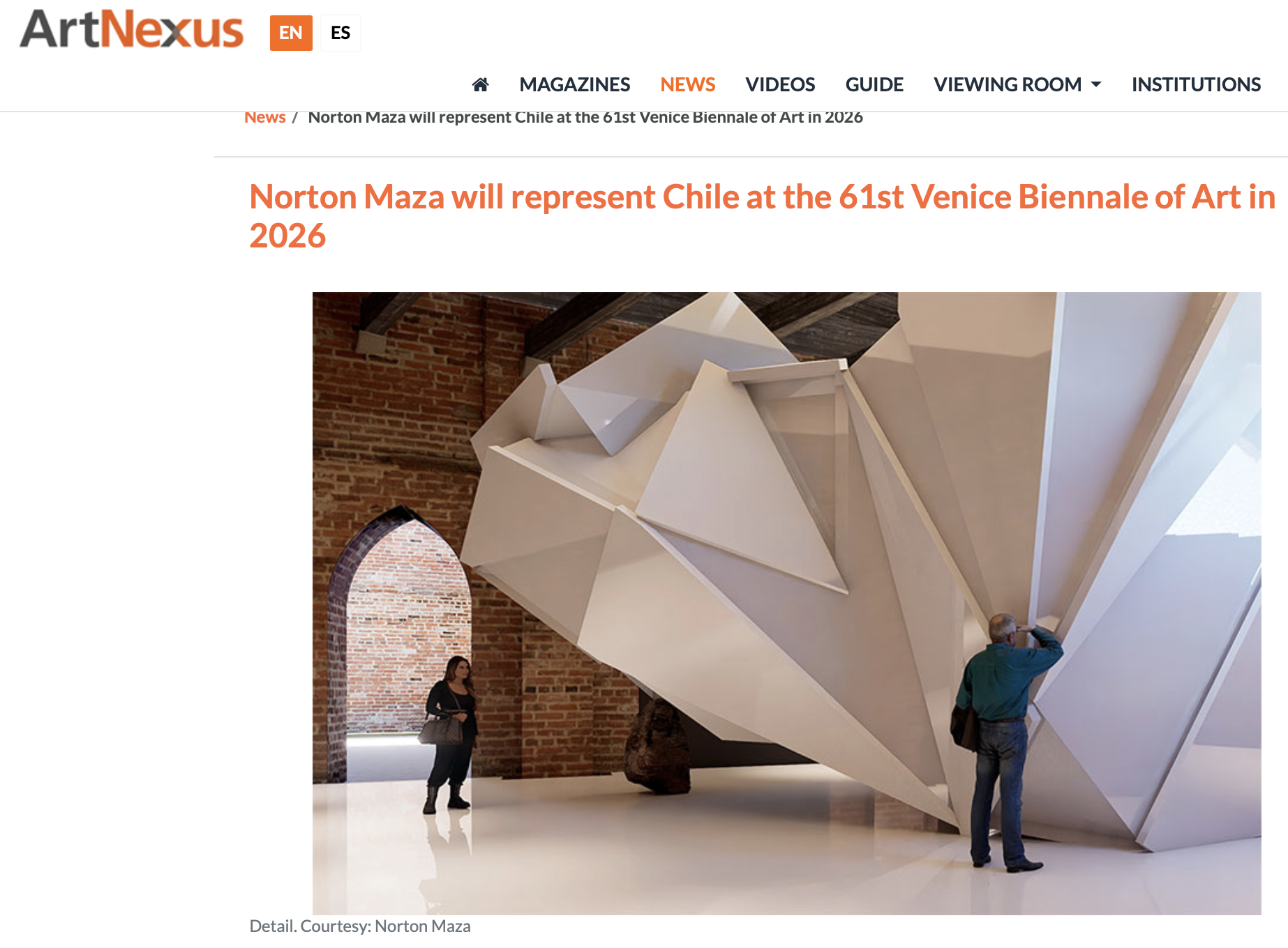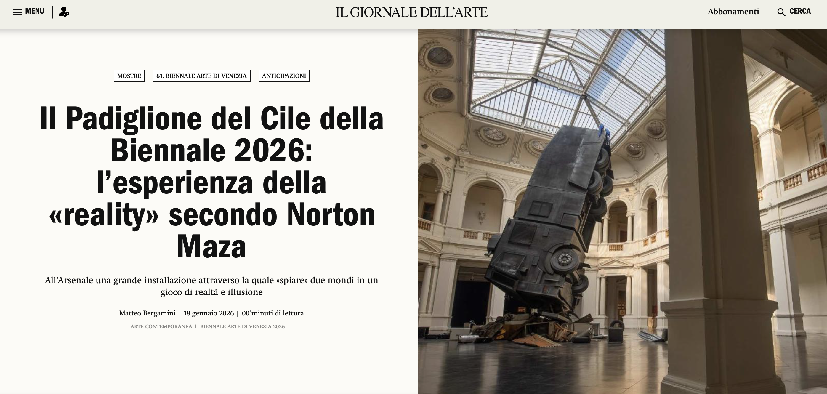 Inter-Reality, del artista Norton Maza, bajo la curatoría de Marisa Cachiolo y Dermis León y la gestión de Claudia Pertuzé, fue la propuesta seleccionada para representar a Chile en la 61° Bienal de Arte de Venecia, evento que se celebrará entre el 9 de mayo y el 22 de noviembre de 2026 en la ciudad italiana.
