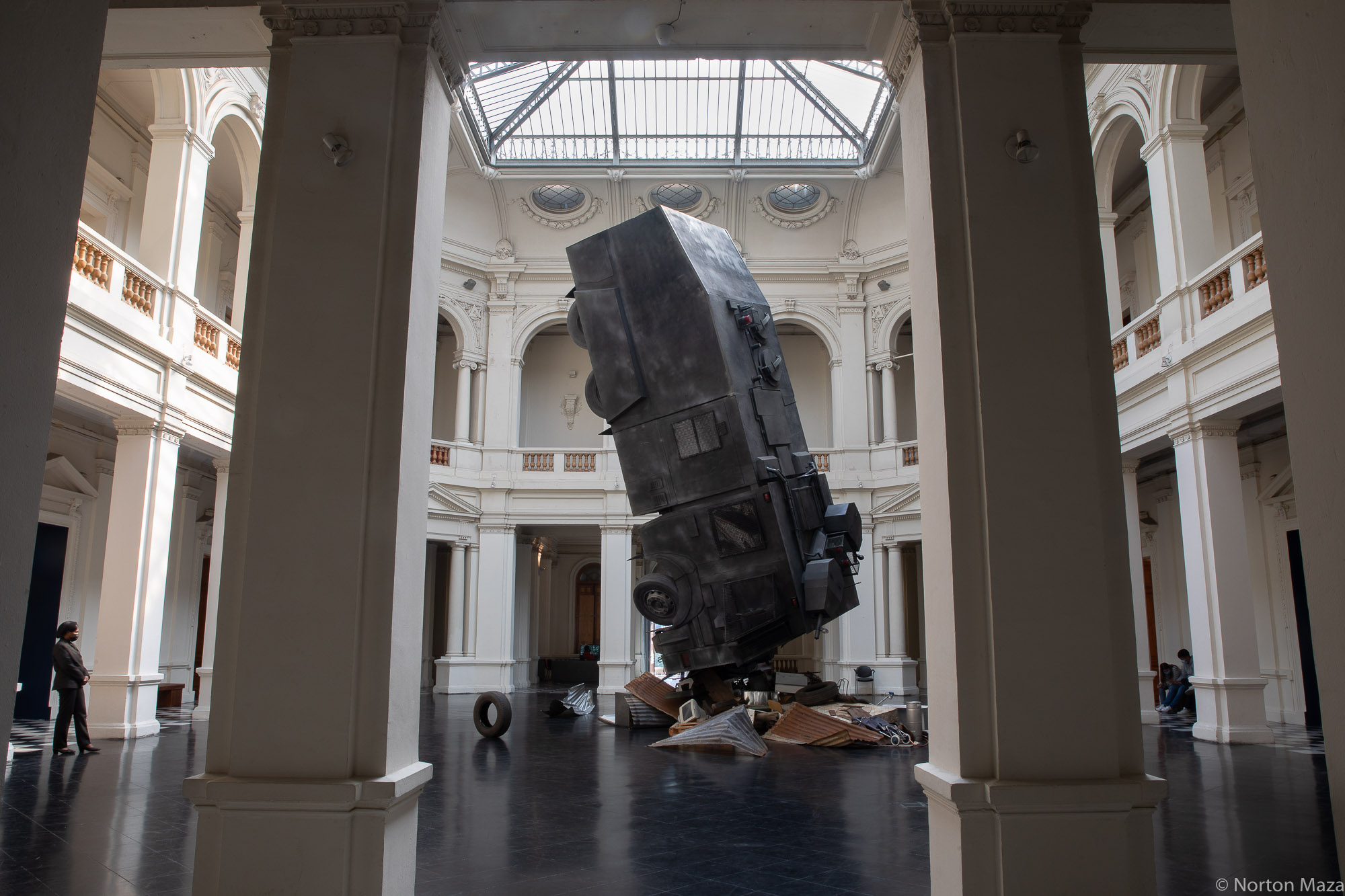 Un camión antidisturbios a escala real, de los que lanzan agua contra los manifestantes, se desestabiliza con un basural de electrodomésticos viejos y oxidados, techumbres oxidadas. Al tener escombro el agua se posan los guacamayos.